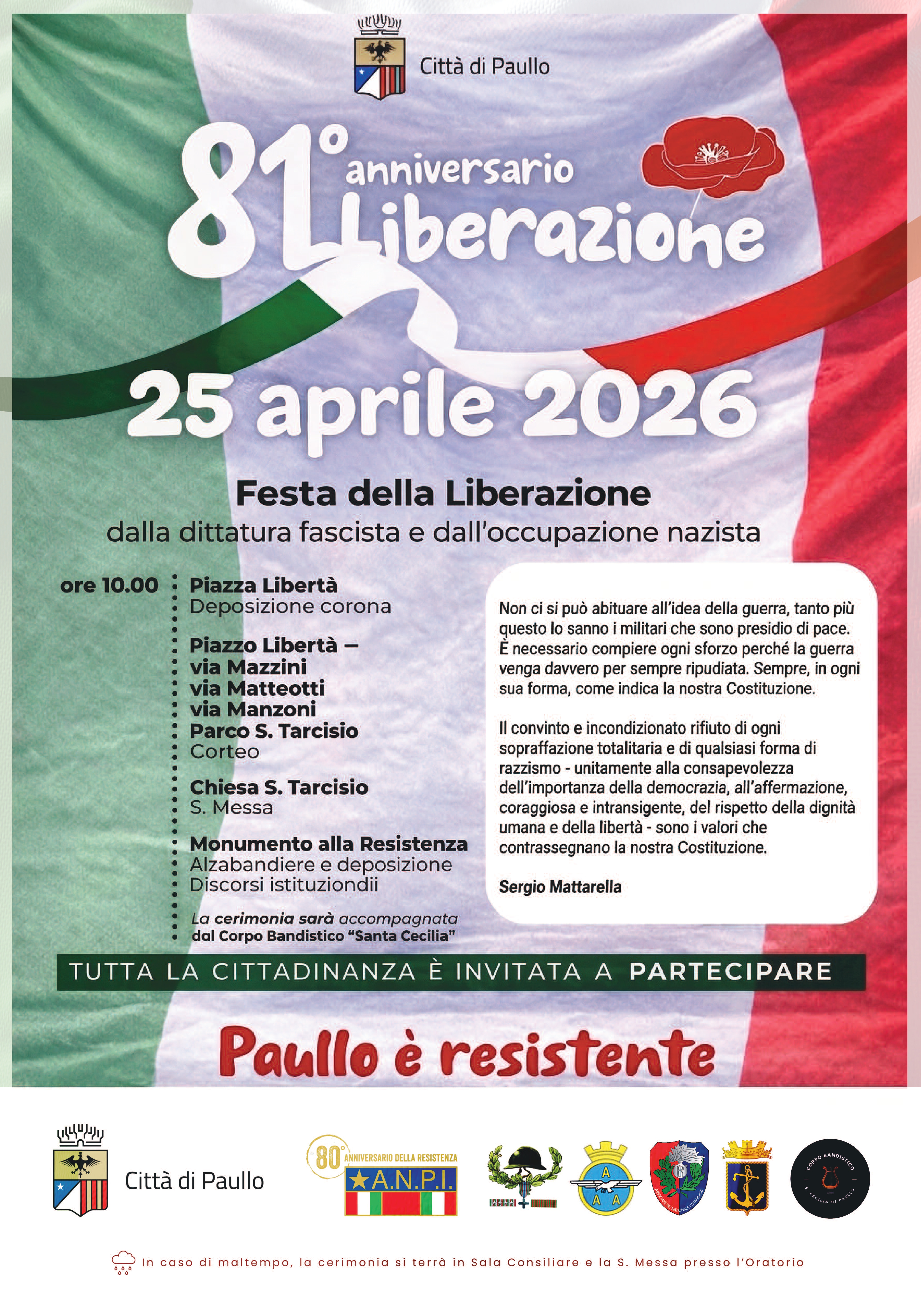 La città di Paullo,insieme alle associazioni presenti sul territorio e al Corpo Bandistico S. Cecilia, celebra il valore della libertà e della pace, temi riconquistati grazie alla Resistenza contro il nazifascismo.