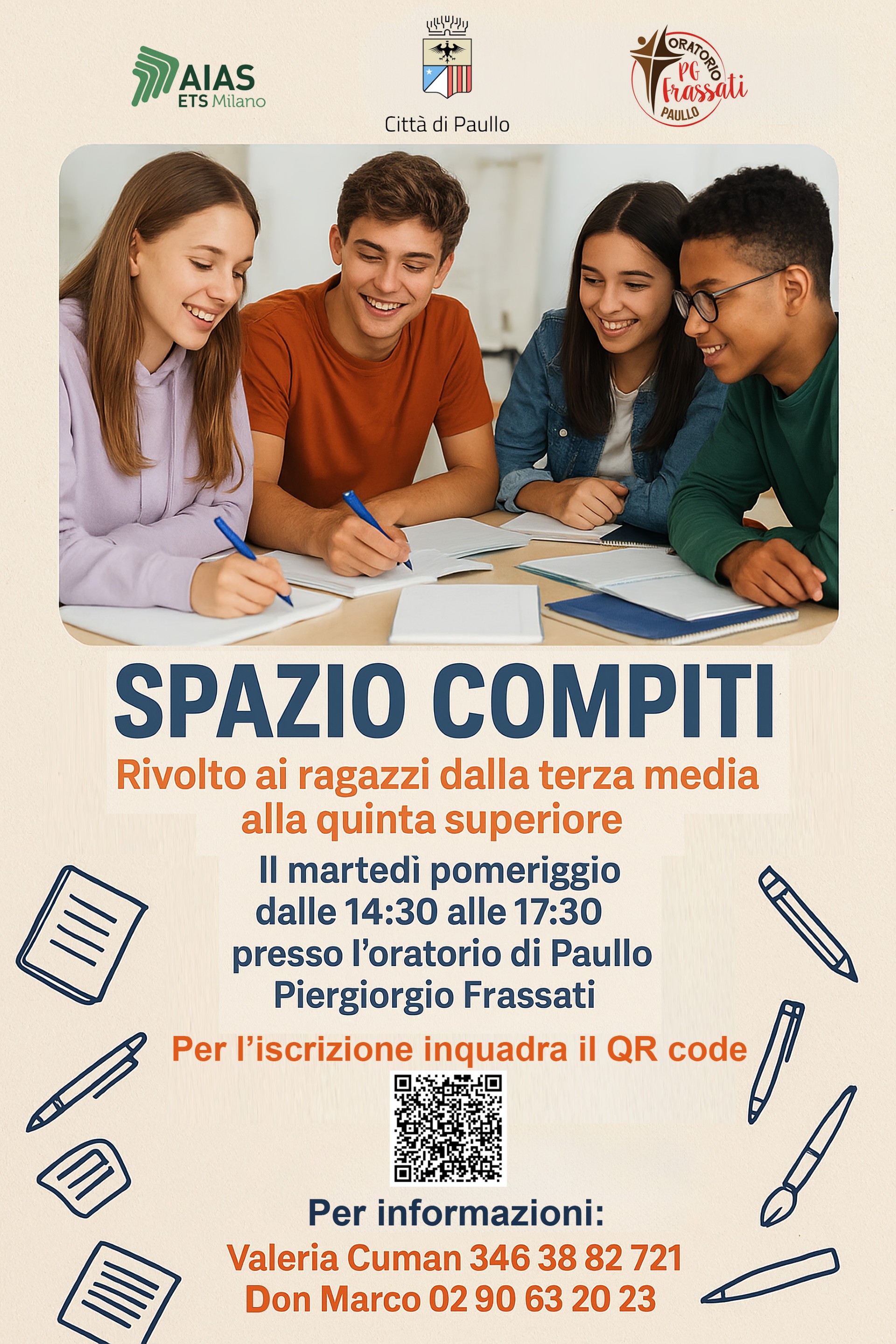 Il Comune di Paullo in collaborazione con l'Oratorio Frassati e l'Associazione AIAS propone ai ragazzi dalla classe 3 della scuola secondaria di primo grado alla classe 5 della scuola secondaria uno SPAZIO COMPITI
